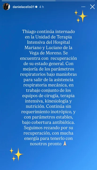 Su expareja Daniela Celis utilizó su cuenta de Instagram para contar las últimas novedades sobre Thiago Medina, que se encuentra internado en terapia intensiva desde hace dos semanas, cuando sufrió un fuerte accidente con su moto.